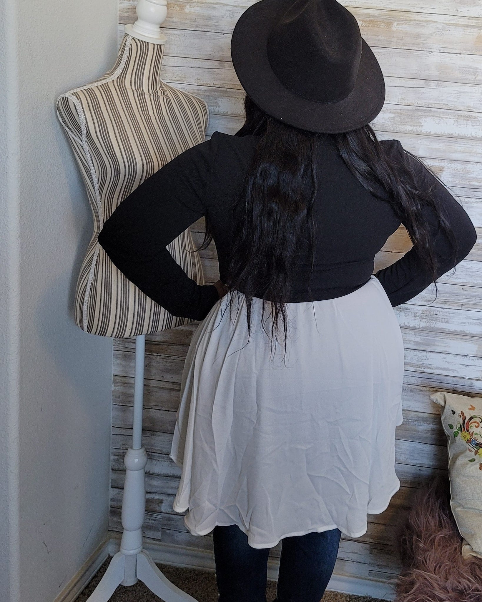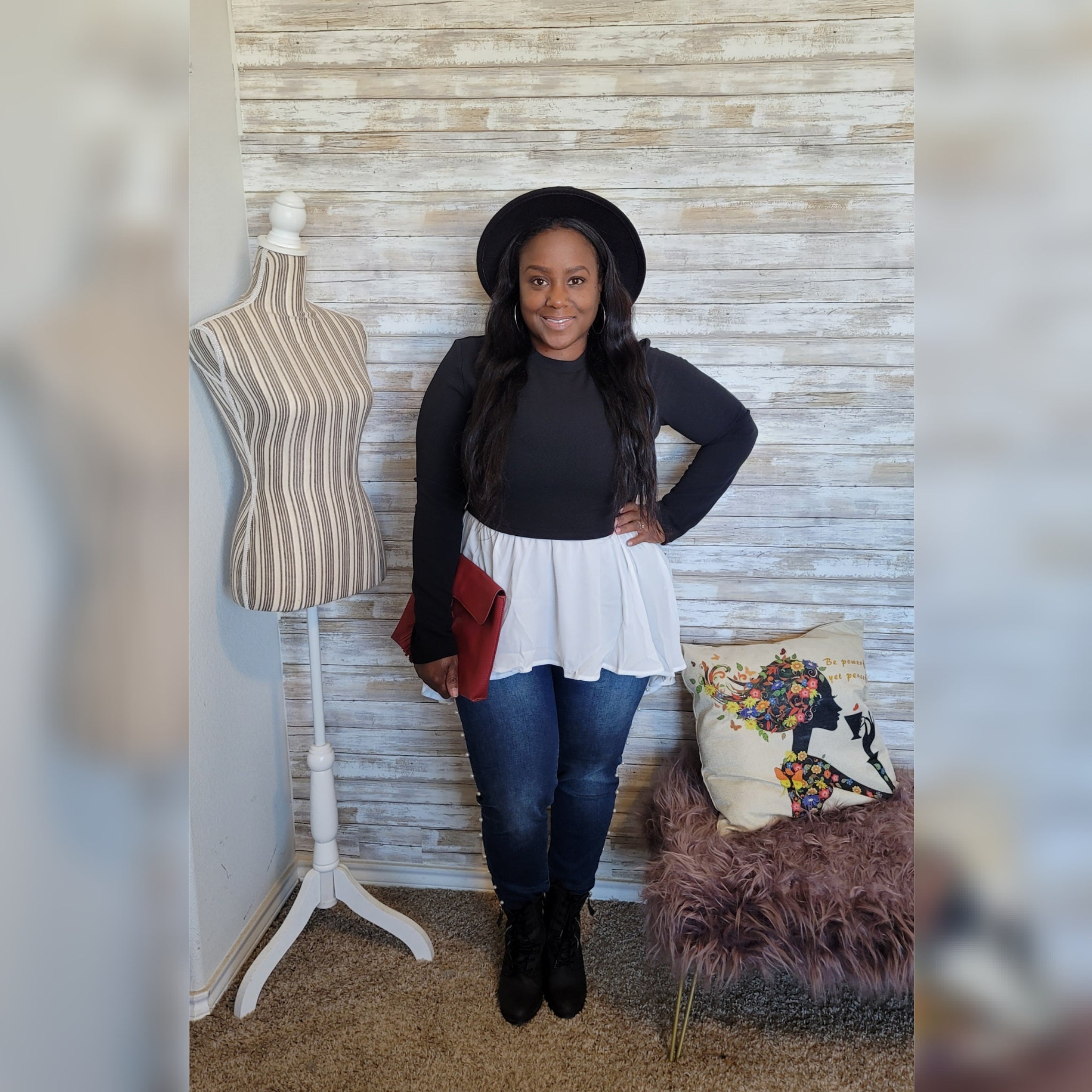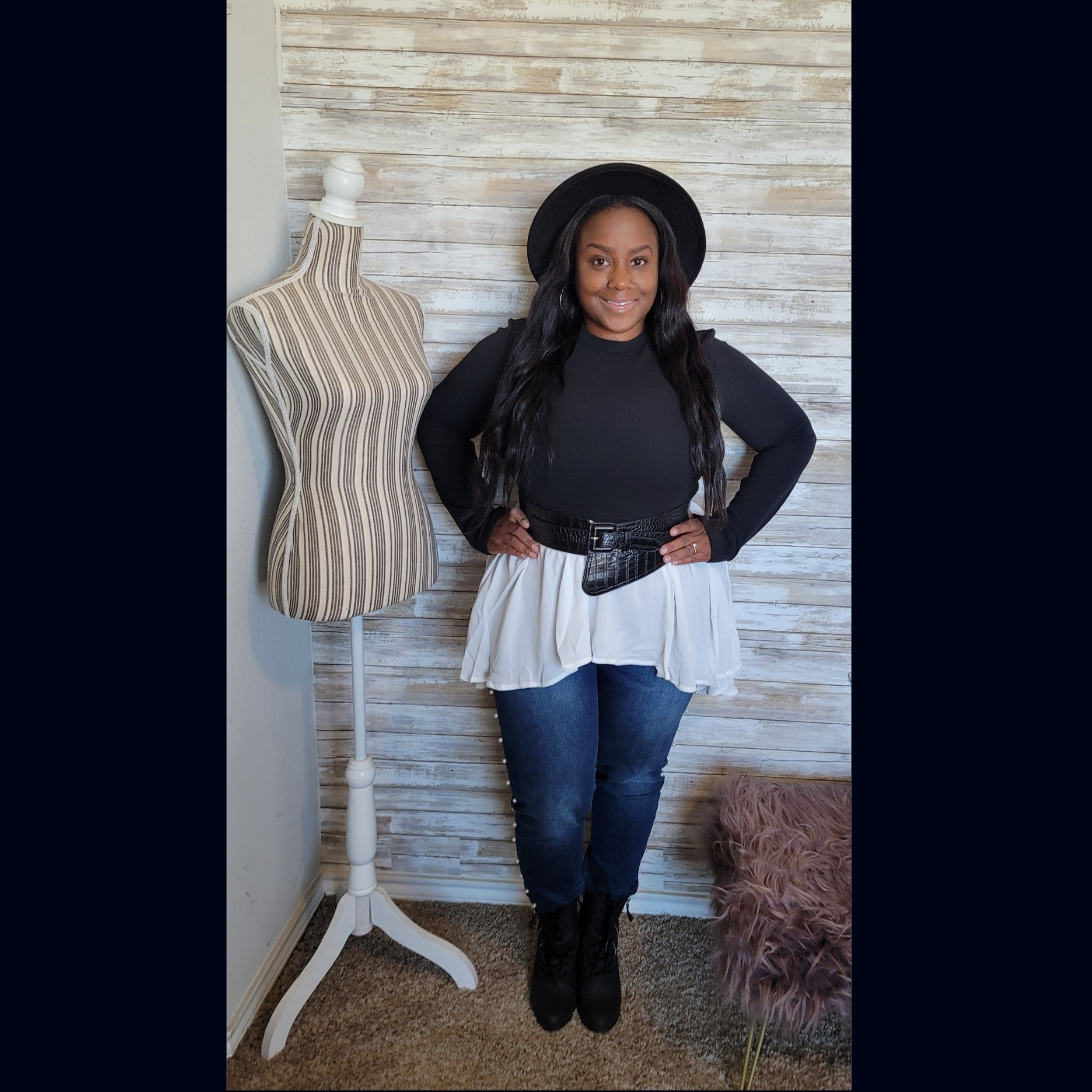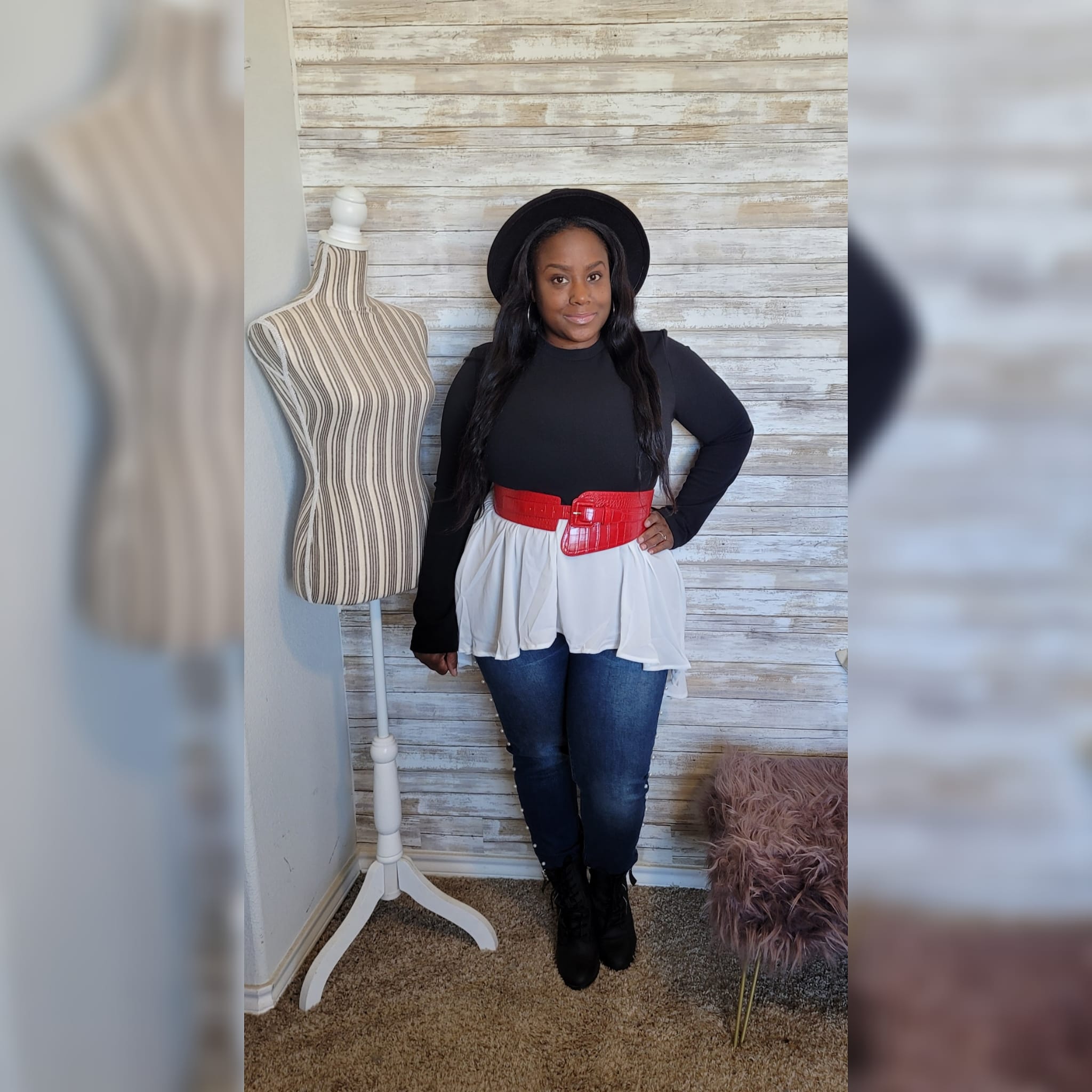 Stretch top, sheer high lo bottom. Perfect for a night on the town! Jeans and belt also available!
